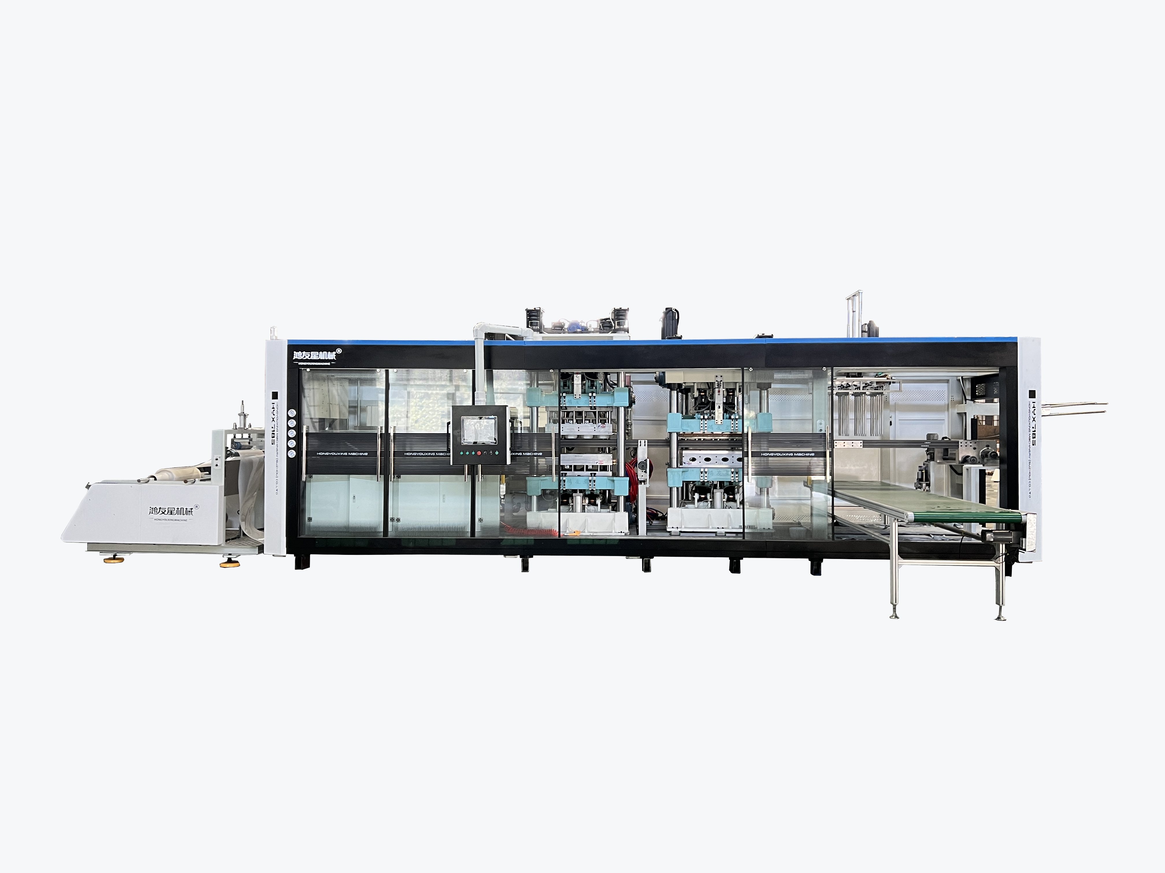 我們的主要產(chǎn)品有 HYX-850全自動正負(fù)壓3/4工位熱成型機(jī)(成型-裁切-沖孔-堆疊)、 HYX-1220 PLC全電腦控制自動真空熱成型機(jī)、 HW-7072負(fù)壓成型裁切一體機(jī)(成型-裁切-堆疊)、 HW-730自動氣壓成型杯蓋碗機(jī)、 厚片吸塑機(jī)、 30-150T液壓裁斷機(jī)、 冷水機(jī)和空壓機(jī)等輔機(jī)、 熱成型模具。